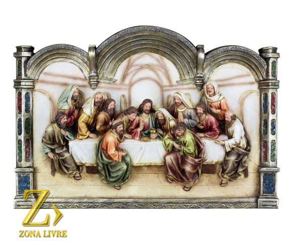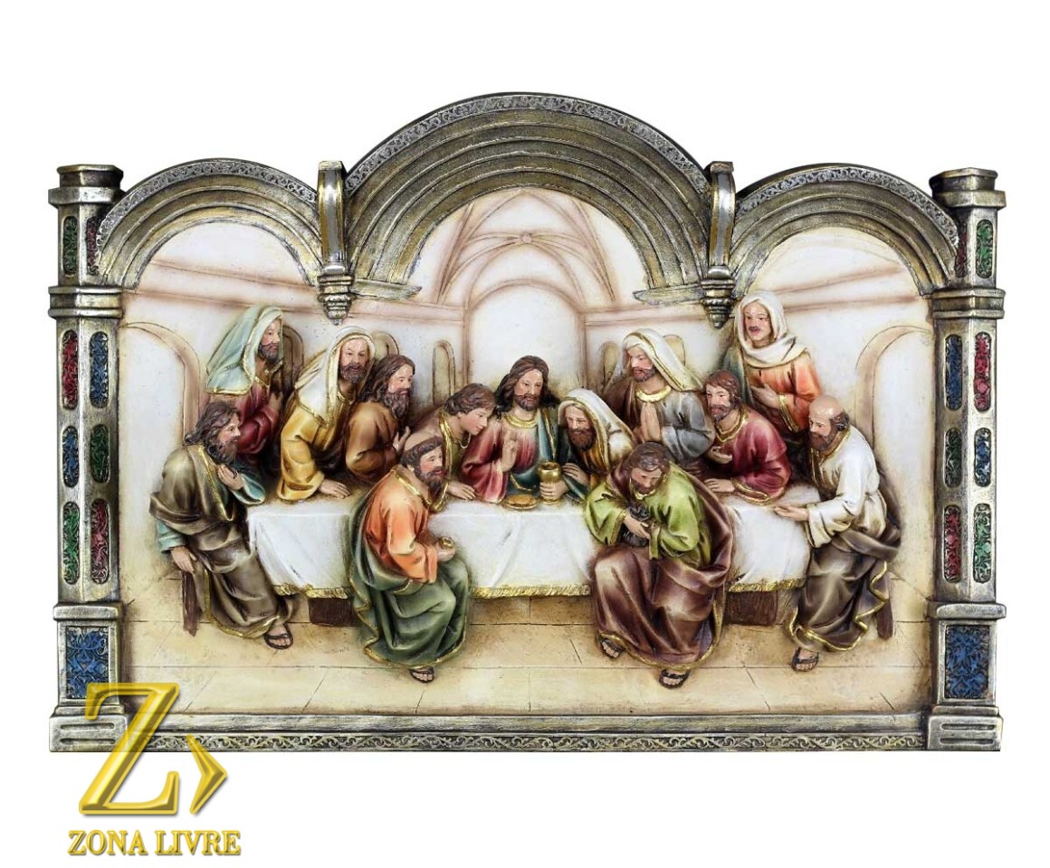 O quadro que retrata a Santa Ceia feito de resina é uma representação artística da icônica cena bíblica. Na obra, os personagens são esculpidos em relevo, conferindo uma sensação tridimensional à pintura. O quadro é elaborado com uma mistura de resina e pigmentos, resultando em cores vibrantes e durabilidade. A cena da Santa Ceia é meticulosamente recriada, com Jesus Cristo no centro da mesa, rodeado por seus discípulos. Detalhes como as expressões faciais, gestos das mãos e vestimentas são cuidadosamente trabalhados, transmitindo realismo à obra.