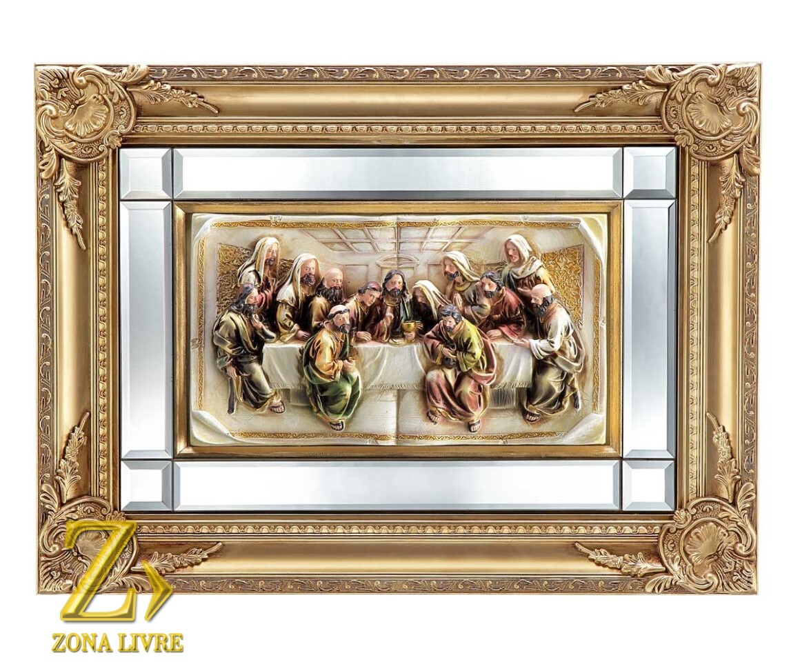 O quadro que retrata a Santa Ceia feito de resina é uma representação artística da icônica cena bíblica. Na obra, os personagens são esculpidos em relevo, conferindo uma sensação tridimensional à pintura. O quadro é elaborado com uma mistura de resina e pigmentos, resultando em cores vibrantes e durabilidade. A cena da Santa Ceia é meticulosamente recriada, com Jesus Cristo no centro da mesa, rodeado por seus discípulos. Detalhes como as expressões faciais, gestos das mãos e vestimentas são cuidadosamente trabalhados, transmitindo realismo à obra.