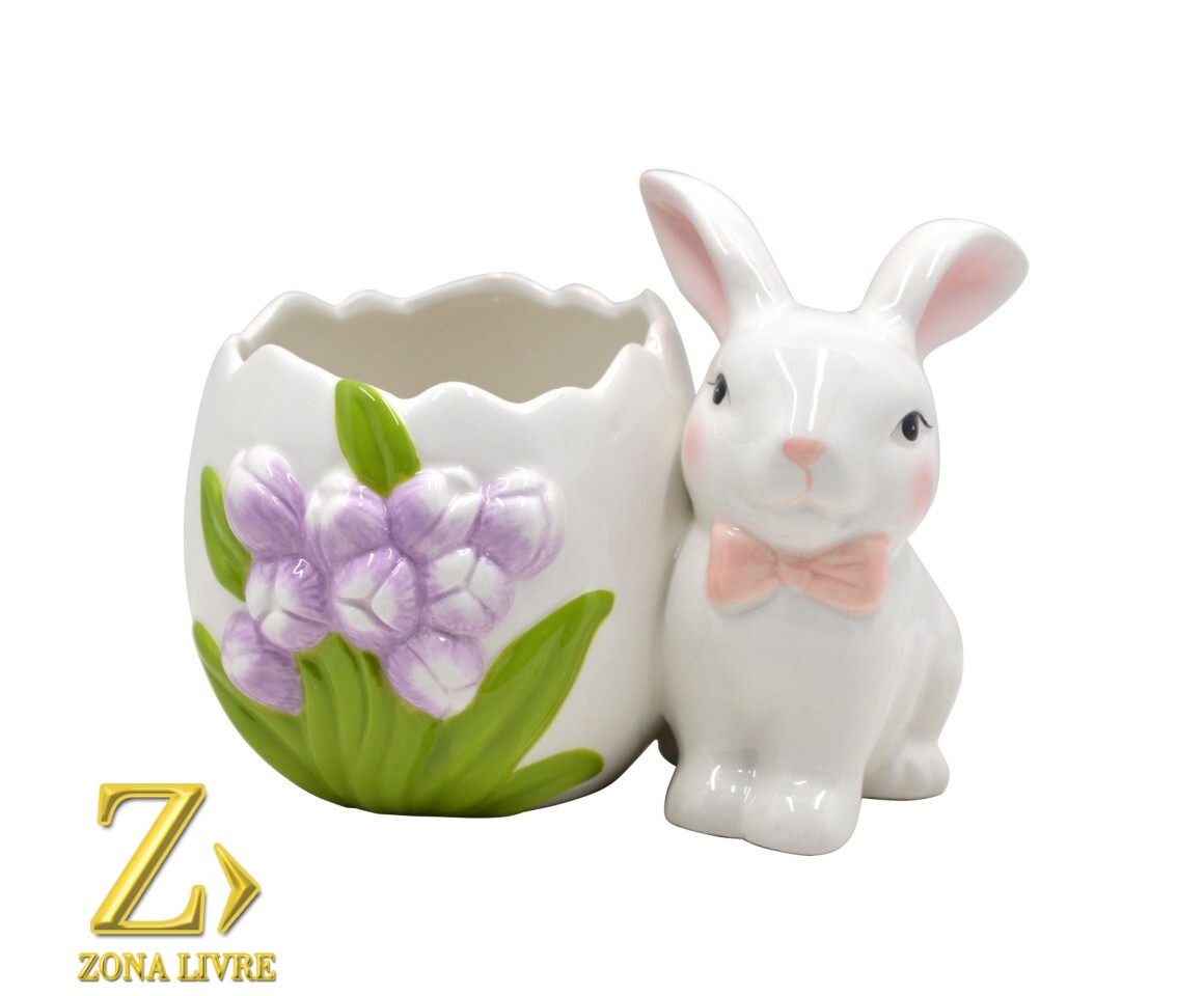 Cachepot decorativo em cerâmica com design de coelho branco e flores roxas. Ideal para usar como vasinho, porta-arranjos ou peça decorativa em mesas, aparadores e ambientes temáticos como Páscoa ou decoração infantil. Acabamento delicado, cores suaves e ótimo para presentear ou complementar sua decoração.