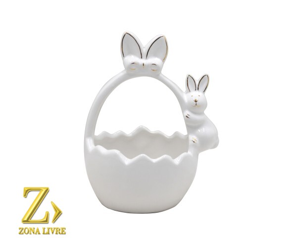 Cestinha Coelho Branco em cerâmica, com acabamento liso e detalhes dourados. O design traz um coelho maior segurando a cesta e um coelhinho menor ao lado, criando um visual encantador.